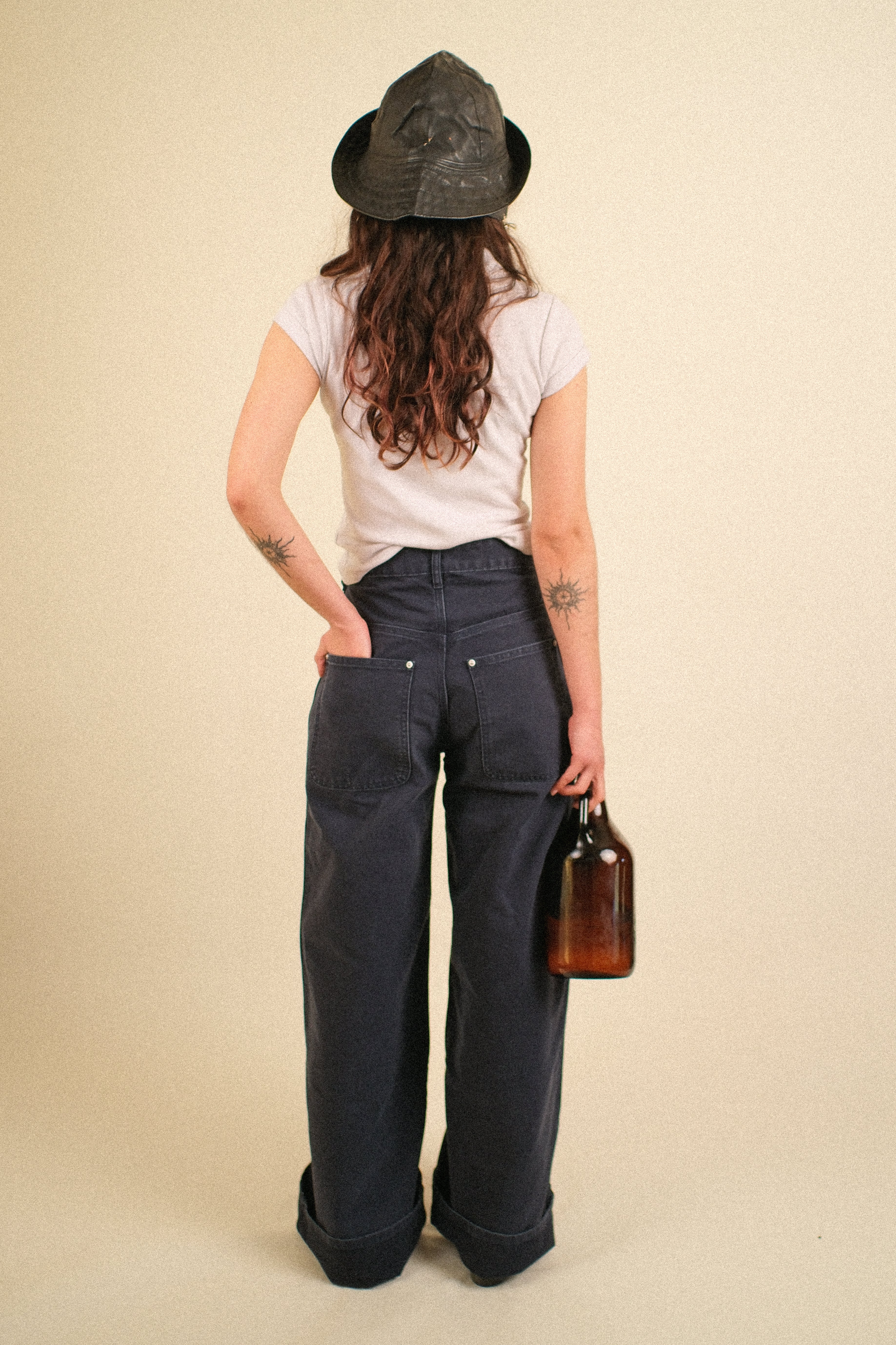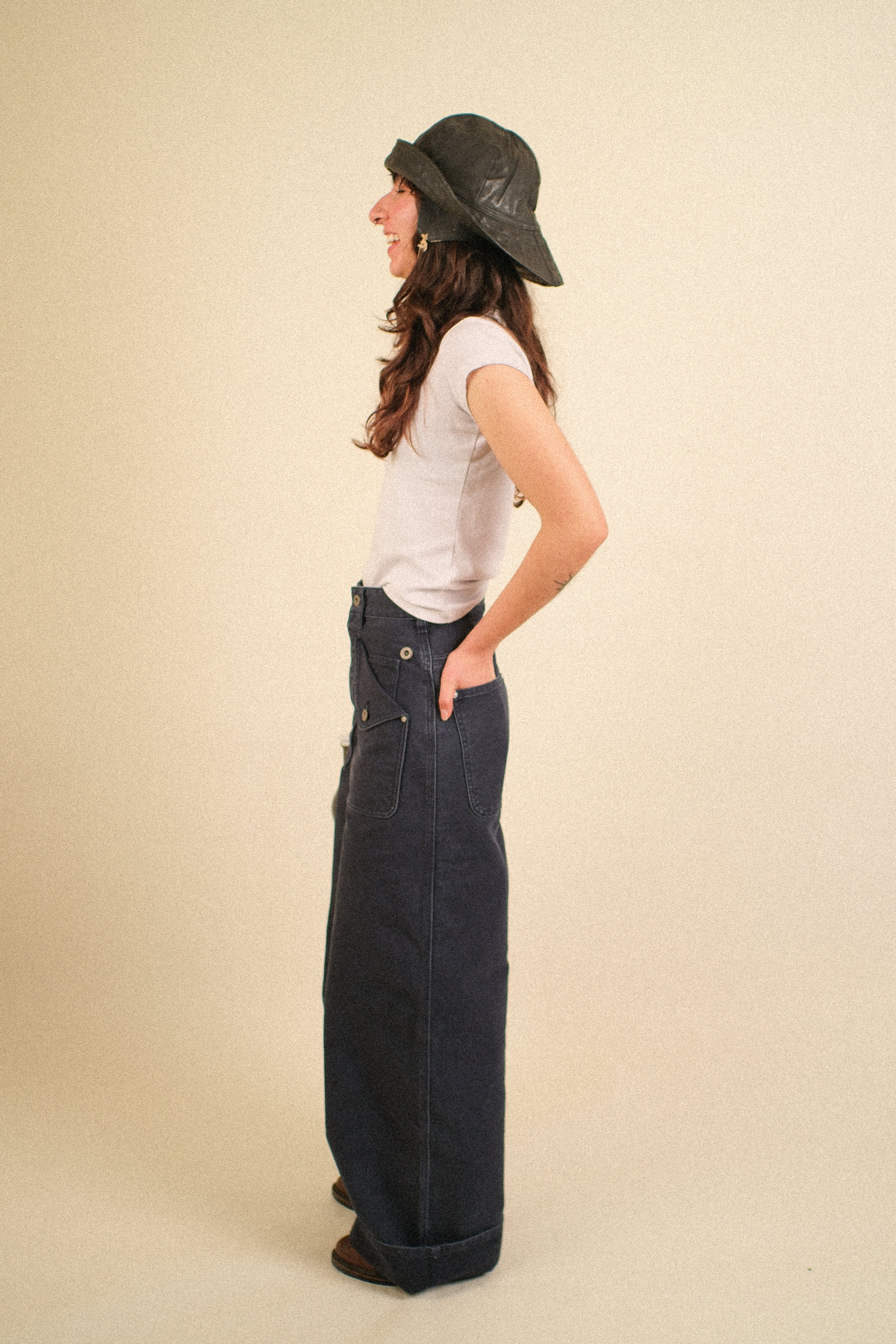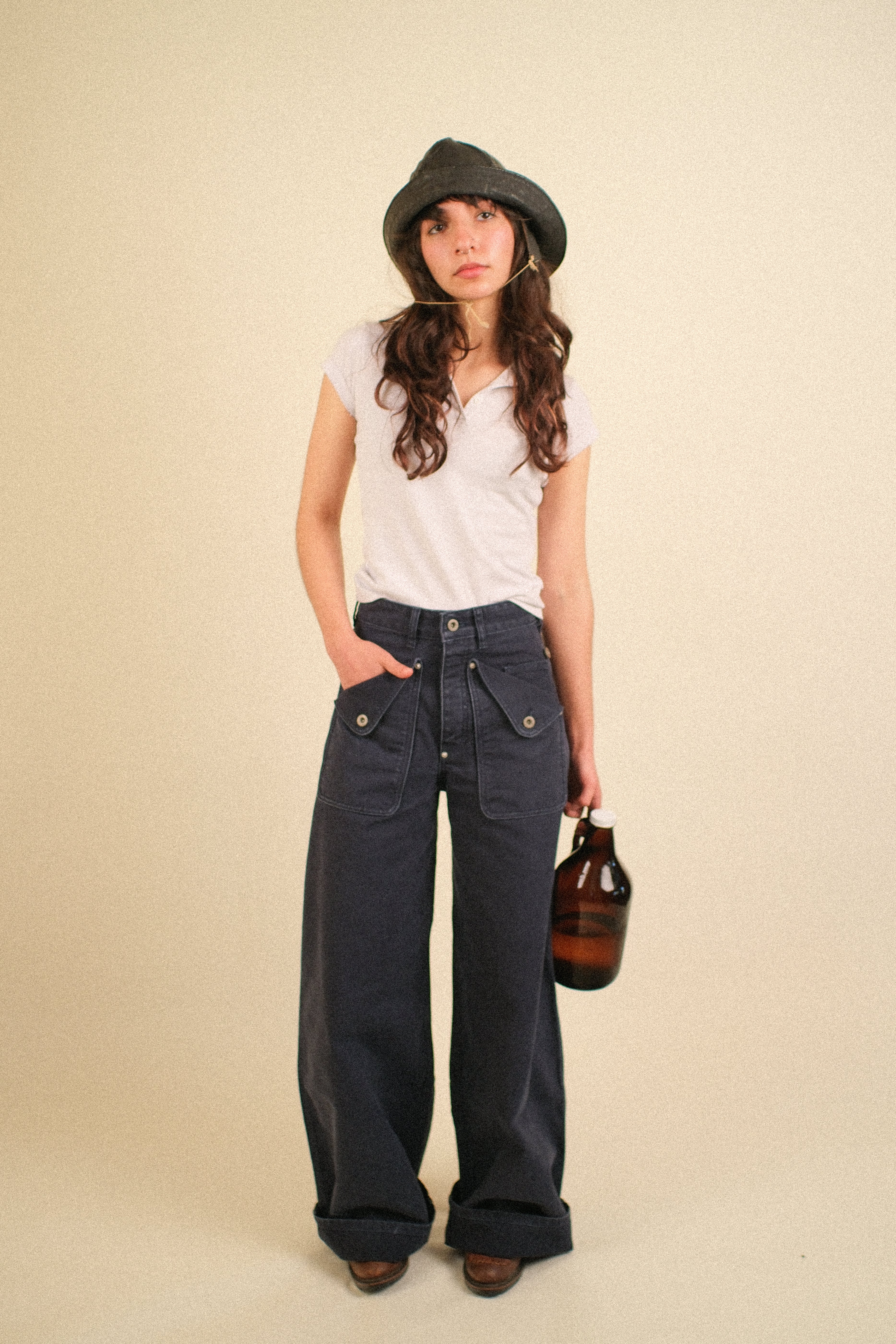 ~ Made in the U.S.A ~ 100% cotton Mt. Vernon Mills canvas ~ Buttoning mule-ear front pockets ~ Brass two-prong buttons ~ Brass heavy-duty rivets ~ Triple-stitched seams ~ Buttoning fly ~